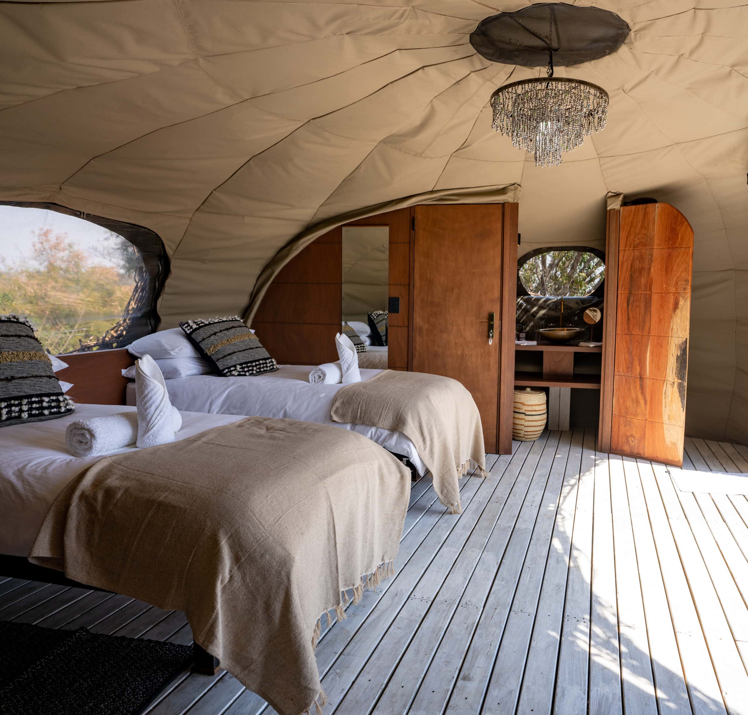 Drawing inspiration from the weaver nests found in the area into its architecture, Chisa Busanga ‘The Nest’ Camp lies on a beautiful island in the heart of the Busanga Plains in Kafue National Park. Overlooking vast flood plains that teem with wildlife, this brand new and uniquely designed, intimate and exclusive camp gives you the ultimate safari adventure off the beaten track. Four human-sized birds’ nests have been raised up into the treetops, blending into their surroundings and offering great views out over the flood plains.