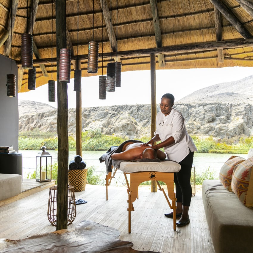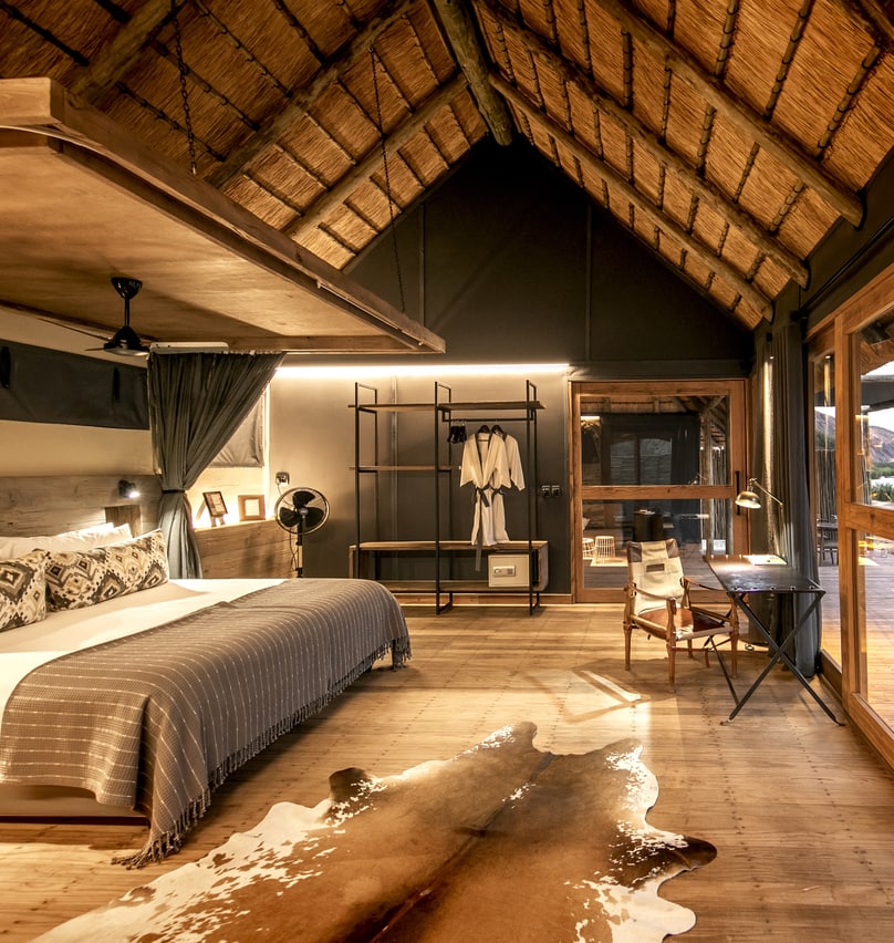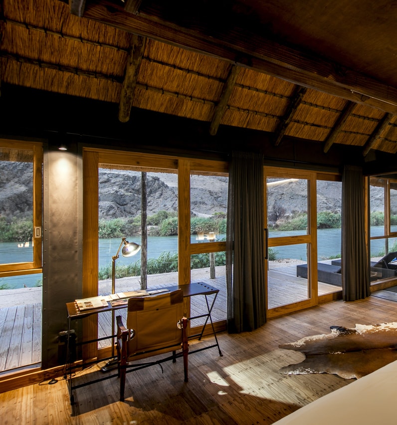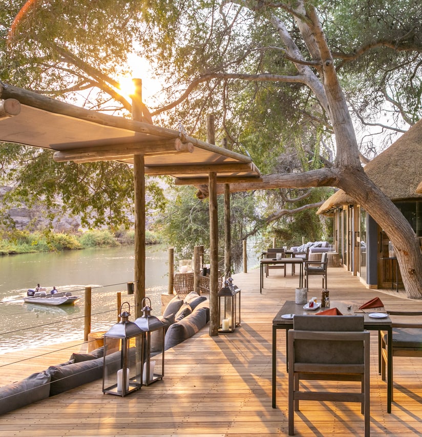 Serra Cafema is an exclusive, remote retreat lying on the Kunene River in north western Kaokoland, combining stunning desert with river views. The camp’s eight unique canvas and thatched chalets, each with its own en-suite bathroom, show great attention to detail; the elevated decks and simple structures of wood, canvas and thatch create a camp that is at one with its surroundings. The dining room and pool look out over the Kunene River. A highlight is the cultural interaction with the local Ova-Himba people. Activities include carefully guided quad biking, boating, birding and guided walks.