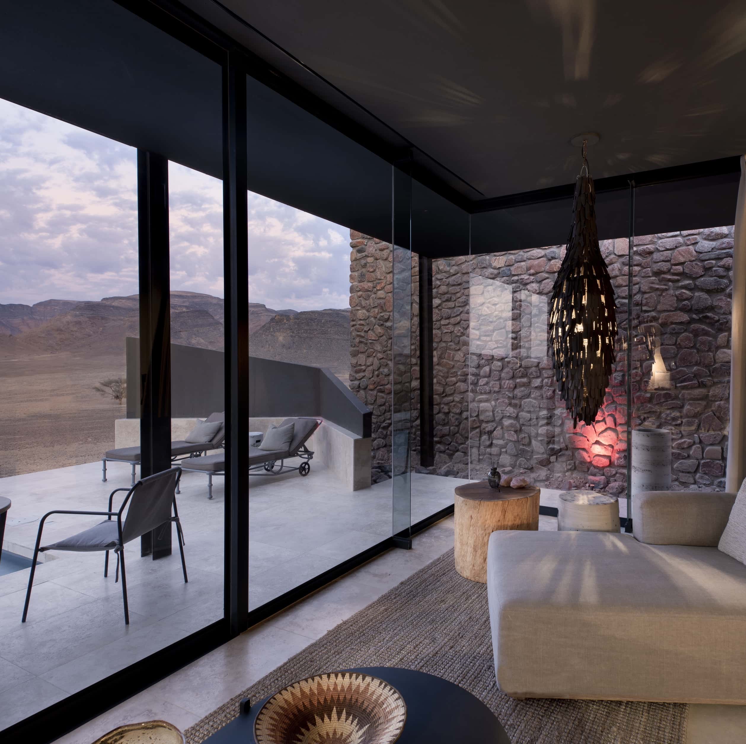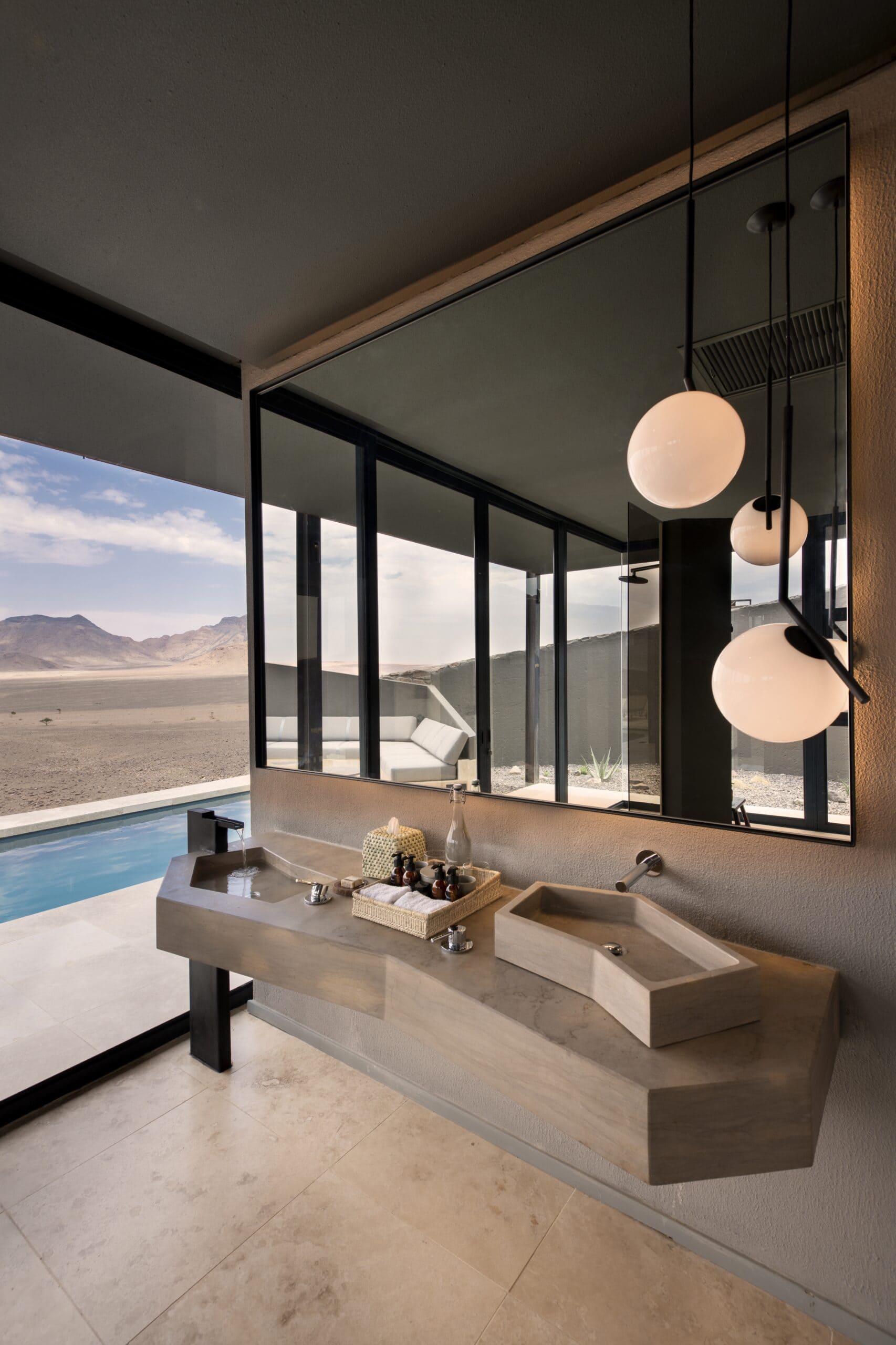 • Safari suites feature frameless glass panels that fold away to reveal unobstructed desert vistas