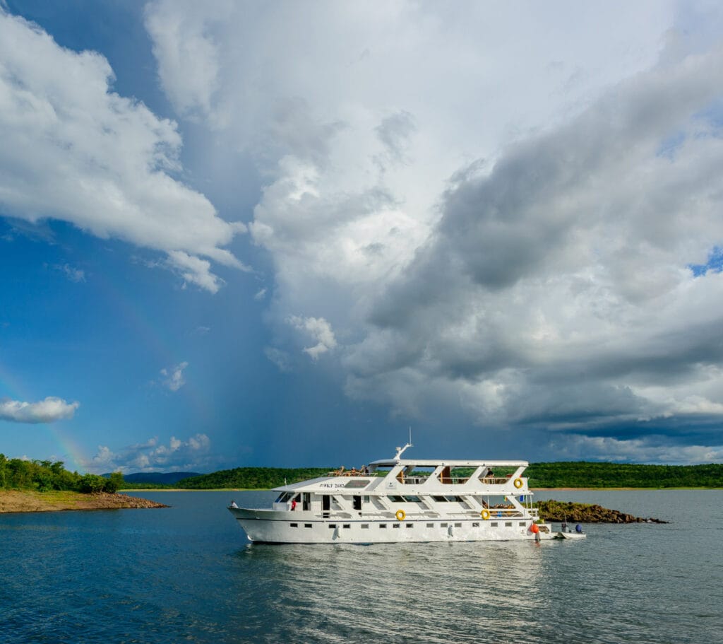 Another standout destination in Zim is Lake Kariba. The world’s largest artificial lake, by volume, is 226km long and, in places, up to 40 km wide. Forming a border between Zimbabwe and Zambia, it can often feel more like a sea than a lake. On the shore, small herds of elephant, buffalo, and hippo graze on the jewel-bright grass. They are best viewed from the cruising comfort of a houseboat, which Kariba is famous for.