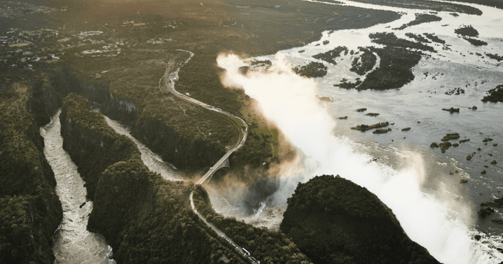 The falls, located on the border between Zambia and Zimbabwe, span over 1.7 kilometres (1 mile) in width, making it the largest curtain of falling water in the world. The sheer scale and power of the falls are a mesmerising sight. The towering mist and spray from the falls is visible from miles away and adds to the falls’ mystique.